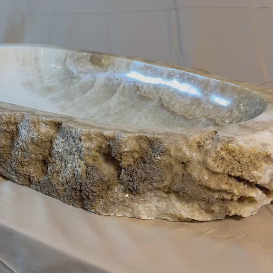 An organically shaped onyx vessel sink hand cut from a single piece of stone with a natural exterior surface and a highly polished bowl and lip. This organically shaped sink great visual interest and beautiful striations.