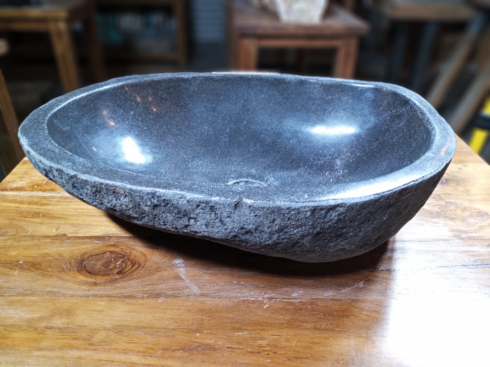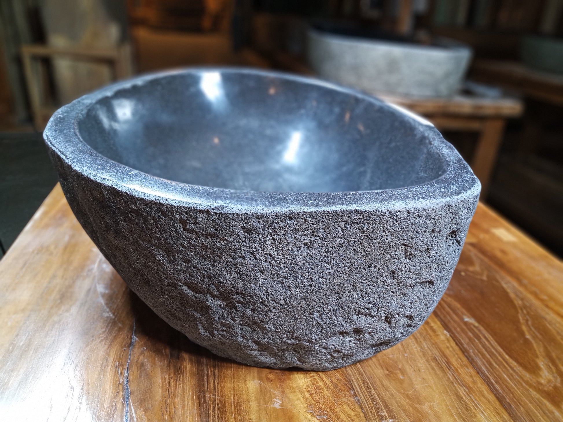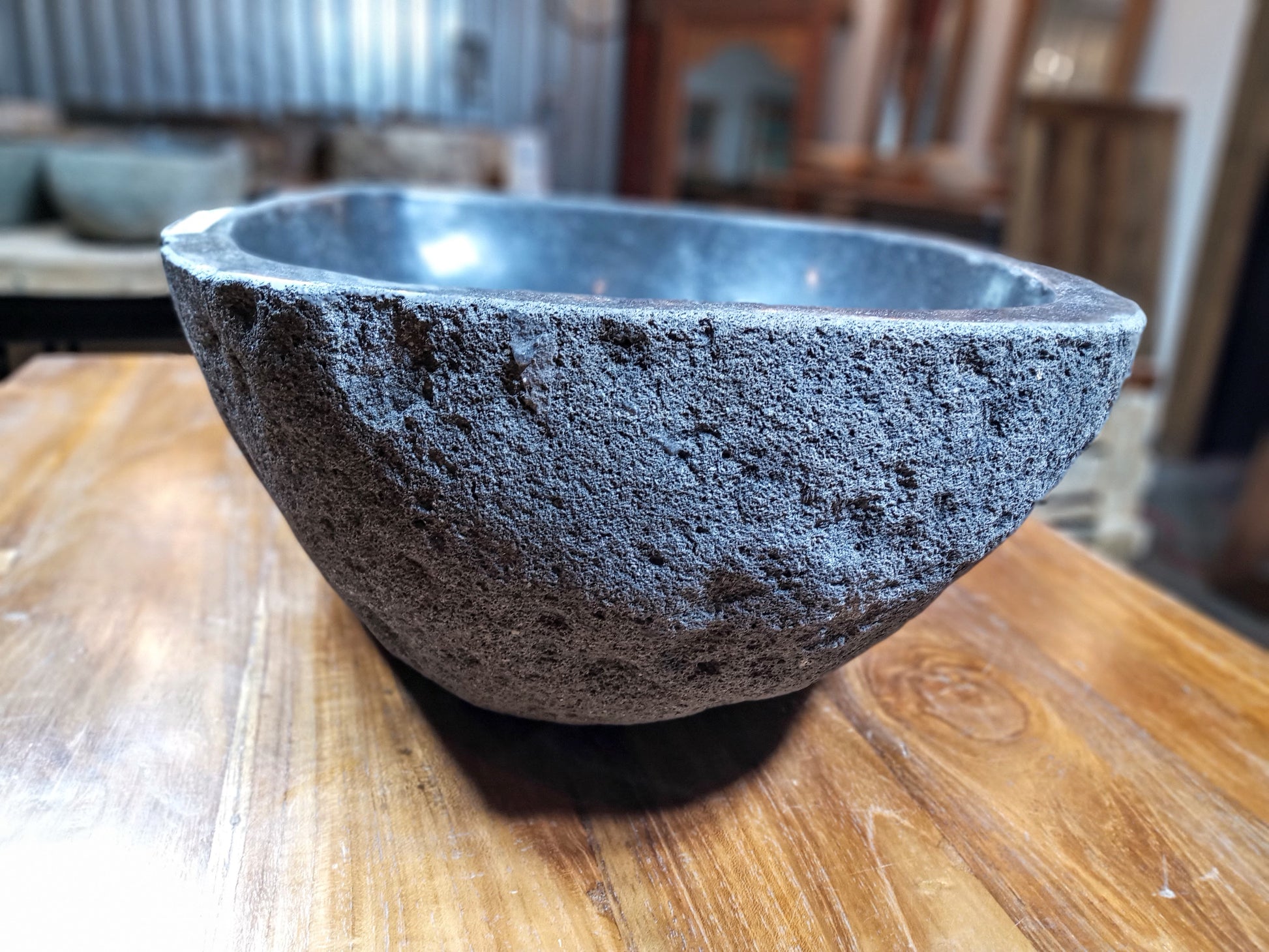 This stone vessel sink looks great on a contrasting teak wood vanity top or any stone surface. Consider installing your natural stone vessel sink on top of one of our reclaimed teak bathroom vanities for a warm, organic look.