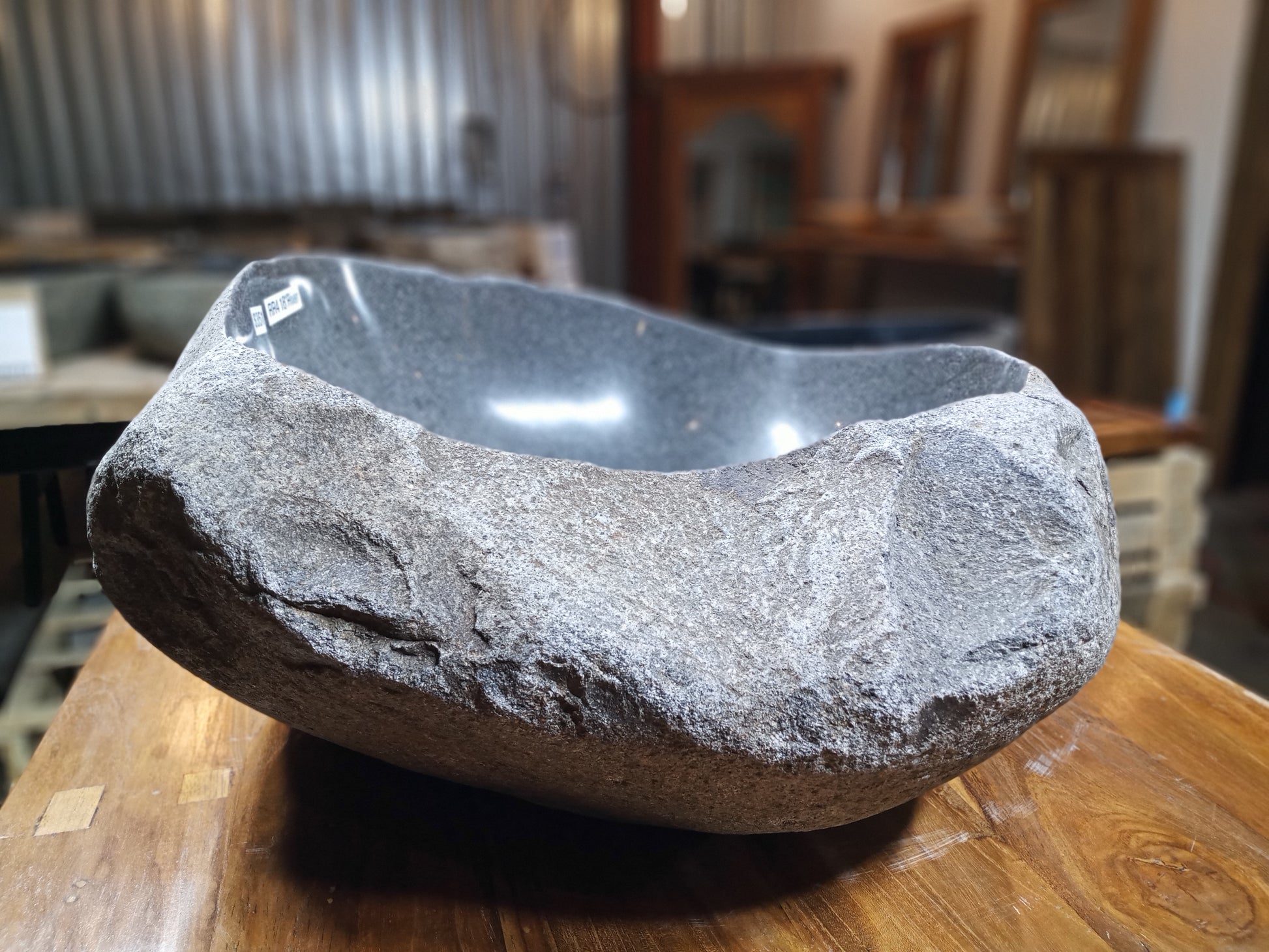 This stone vessel sink looks great on a contrasting teak wood vanity top or any stone surface. Consider installing your natural stone vessel sink on top of one of our reclaimed teak bathroom vanities for a warm, organic look.